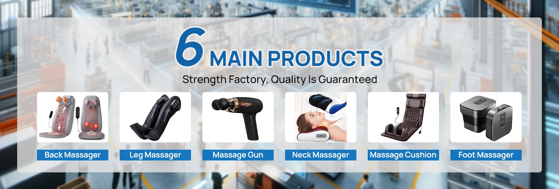 Productos principales:Dispositivo de masaje, Pistola de masaje, Masaje de piernas, Masaje de cabeza, Masajeador de cuello
